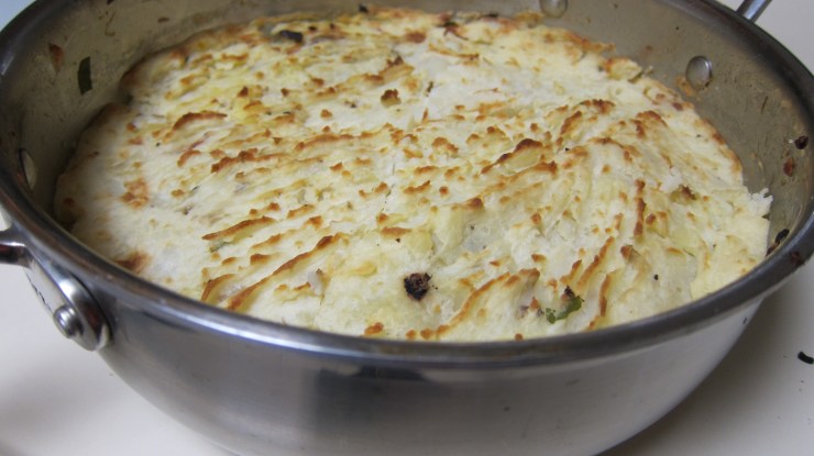 - Top the meat and vegetables with the mashed potatoes and place the pie into a 400F preheated oven for about 20 minutes. Broil to brown the potato if necessary.