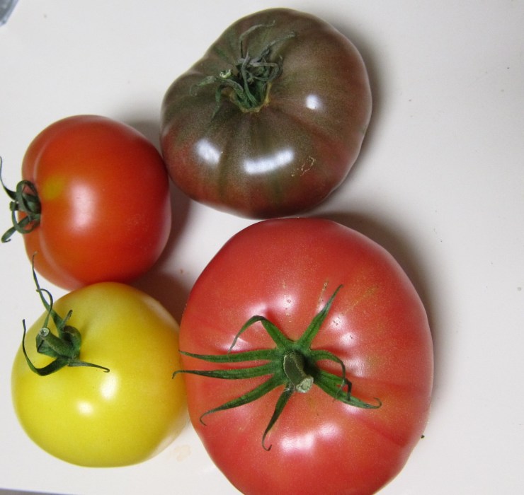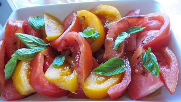 I just sliced the tomatoes in big wedges, sprinkled them with a little salt and black pepper, drizzled an equal amount of olive oil and balsamic vinegar (you could also use red wine vinegar instead of balsamic if you want), and added basil leaves I picked from my container garden. I covered the plate and chilled it for a bit before serving. Easy and yummy!