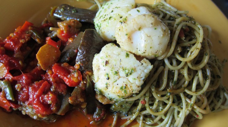Yesterday, I gazed at the abundance of fresh produce our friends gave us. I also noticed that my basil plants were in full force. A dinner idea came to mind: that eggplant/tomato dish and my basil pesto pasta with pan-seared sea bass and sea scallops. What a great flavor and color combination they made! The green basil pesto coated the pasta with that fantastic basil fragrance, the savory taste from the cheese, and nuttiness of pine nuts. The eggplant/tomato dish gave out sweet, tangy, and fresh flavors that wonderfully complemented the pesto pasta taste. So delightful!