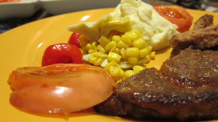 I served the steak with sweet corn-pickled sweet and spicy pepper-roasted artichoke salad, slices of heirloom tomato drizzled in olive oil and balsamic vinegar, and celery root potato puree. What a fantastic dinner!
