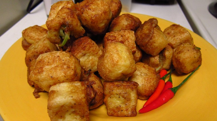 Here’s another Indonesia’s favorite snack: stuffed tofu! The idea is quite simple: fill up tofu (cubed fried tofu, light and airy inside. Sold at Asian groceries.) with cooked vegetables, dip them in thin batter of flour and spices, brown in a little bit of oil, and eat them with chili peppers! One of Jeff’s aunts made these scrumptious snack for us when we visited the family in Indonesia a while back. Oh la la…so delicious. If only delivery across the ocean weren’t an issue, we’d shamelessly request these stuffed tofu from her all the time.