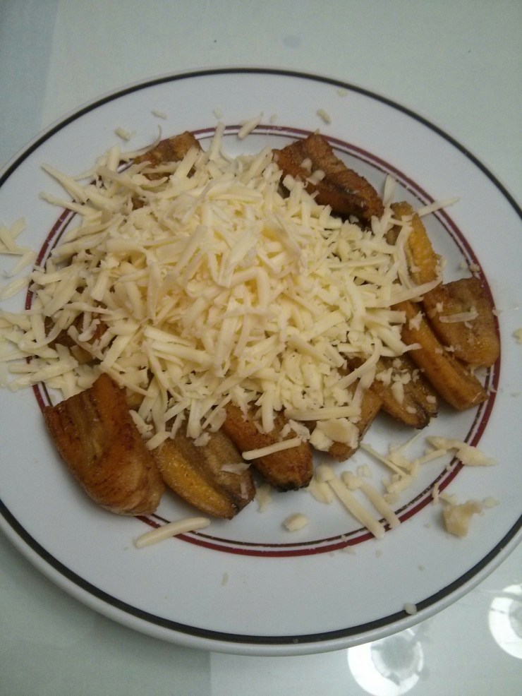 - Turn off the stove, move the bananas to a plate, sprinkle the shredded cheddar on top