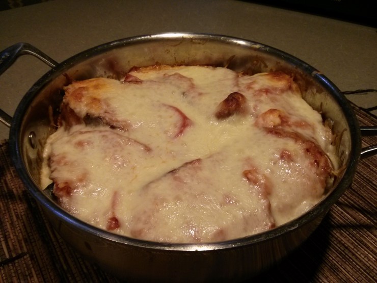 • In a small saucepan, cook the slices of tomatoes and garlic together until they dissolve into watery sauce. Add a can of tomato sauce (add herbs that you like here: oregano, basil, etc.) and a little bit of salt and pepper. Set aside.