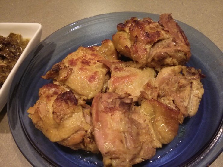When hunger and inspiration come together, delicious dishes appear. That was the case for me today. I had some chicken thighs, kale, and onions in the fridge, along with coconut milk. Added some spices: ginger powder, turmeric powder, coriander powder, salt, pepper, and lemongrass, and put them all in a slow cooker.  Left it on high for about four hours and let the magic happened. The sweet smell of coconut milk mixed onions, lemongrass, and kale made the chicken so aromatic. The meat was so tender and melted in the mouth. And the kale tasted so rich for being cooked with all of the spices and juices from the chicken. I separated the chicken and kale at the end. I also wanted to add some golden color on the chicken so I put it in the oven to broil for five minutes (this last part is completely optional).